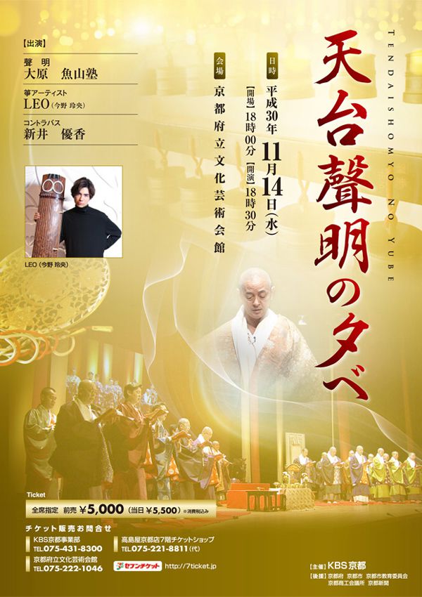 201811.14WED 京 都 | 天台聲明の夕べ 2018年11月14日(水)18:30開演/18:00開場京都府:京都府立文化芸術会館 出演 大原魚山塾(聲明)、LEO(箏)、新井優香(コントラバス) チケット 前売 5,000円、当日 5,500(全席指定・税込) KBS京都事業部 075-431-8300 高島屋京都店7階チケットショップ 075-221-8811 京都府立文化芸術会館 075-222-1046 主催 KBS京都