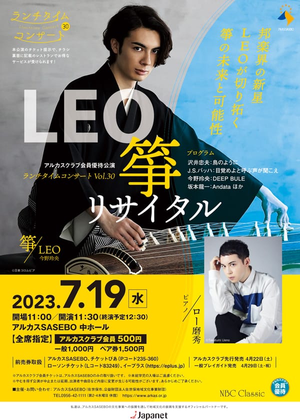 古典からクラシック、現代音楽、ジャズ、ポップスなど、幅広いジャンルに挑戦し、ジャンルの枠を超える多彩なステージを披露。箏の魅力と可能性を常に発信し、「情熱大陸」や「題名のない音楽会」、「徹子の部屋」、「紅白歌合戦」出演など、メディアからの注目も熱い、今話題のLEO・今野玲央がランチタイムコンサートに登場