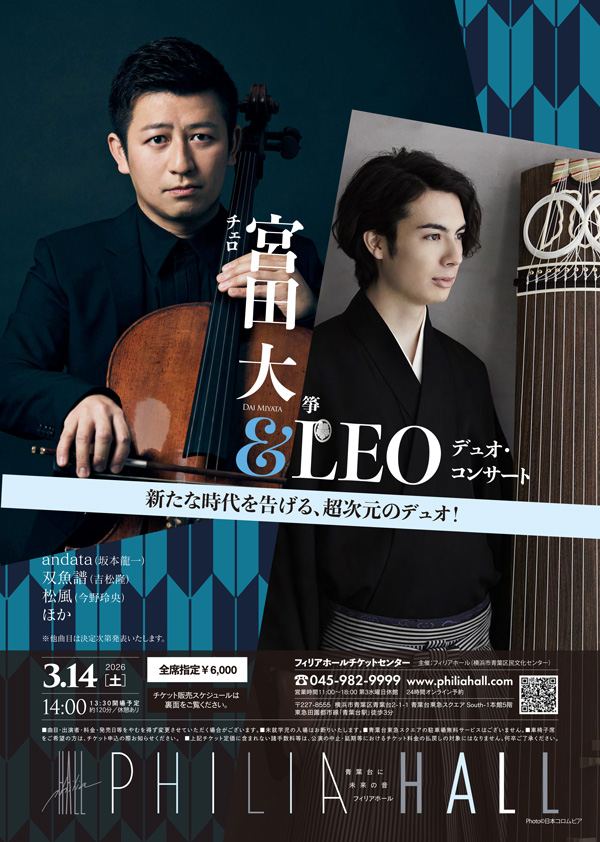 自らの領域で比類なき存在感を示す、チェリスト・宮田大、箏奏者・LEO。それぞれフィリアホールで名演を繰り広げてきた名手たちが、今回待望のデュオで共演を果たします。